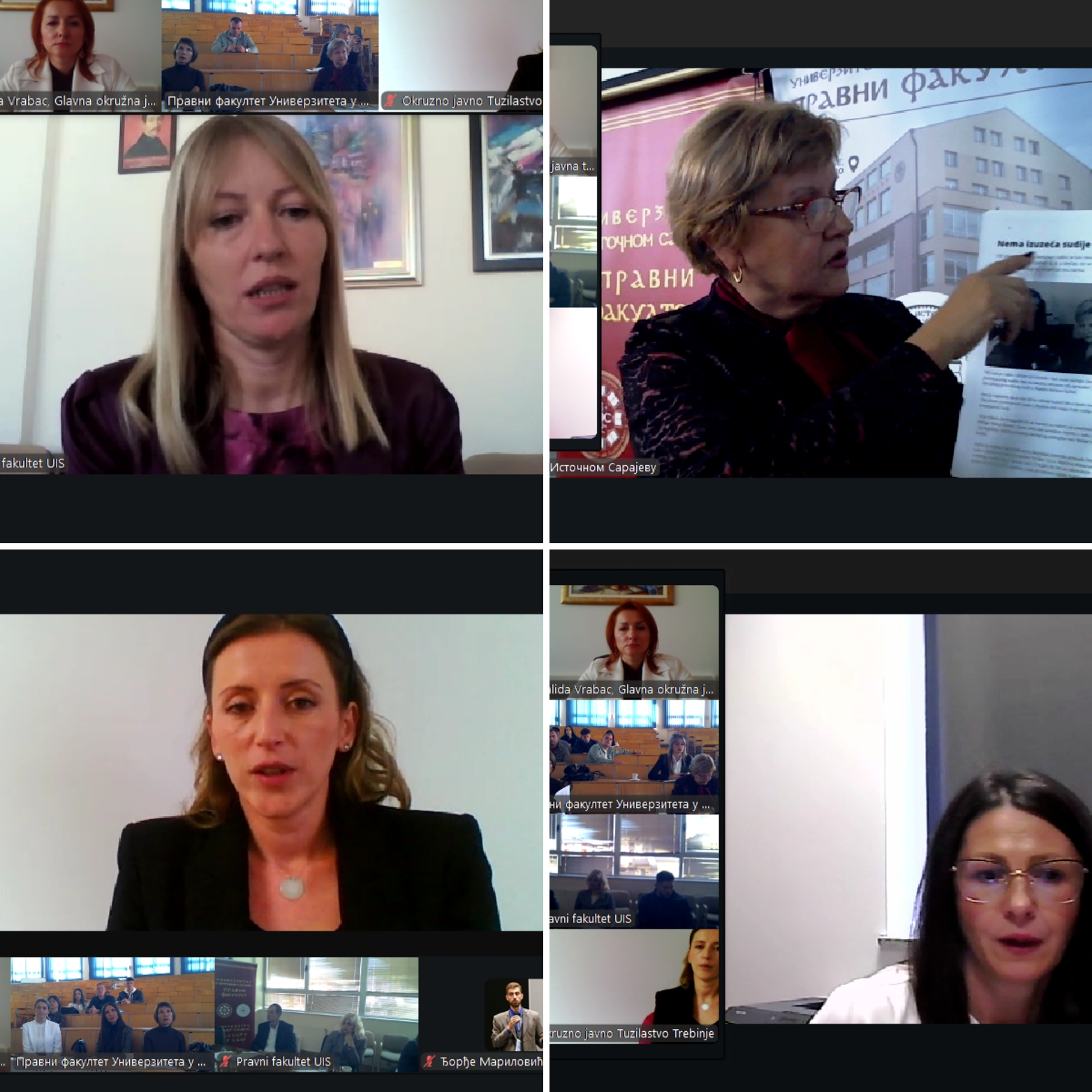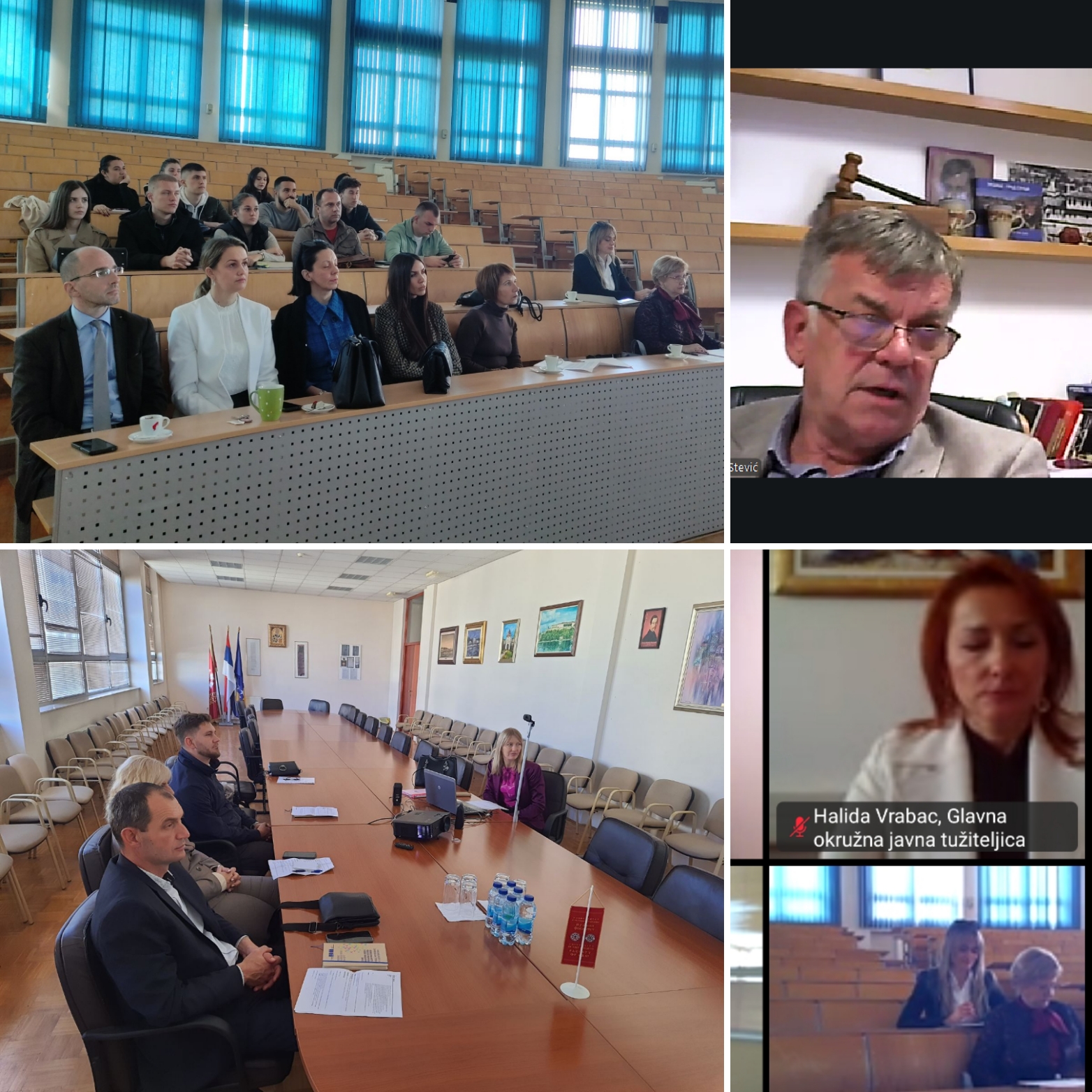 Prvi dio programa bio je posvećen referatima „Mediji i pravosuđe, pogled tužilaštva“, koji je saopštila glavni okružni javni tužilac Halida Vrabac iz Okružnog javnog tužilaštva u Istočnom Sarajevu, zatim „Mediji i pravosuđe, primjeri izvještavanja o toku sudskog postupka“ koji je izložila sudija Božana Gužvić, predsjednica Okružnog privrednog suda u Bijeljini, i „Mediji i pravosuđe, sloboda ili zloupotreba govora i izvještavanja“ koji je saopštio sudija Bojan Stević, predsjednik Okružnog suda u Trebinju. O referatima je održana bogata diskusija.