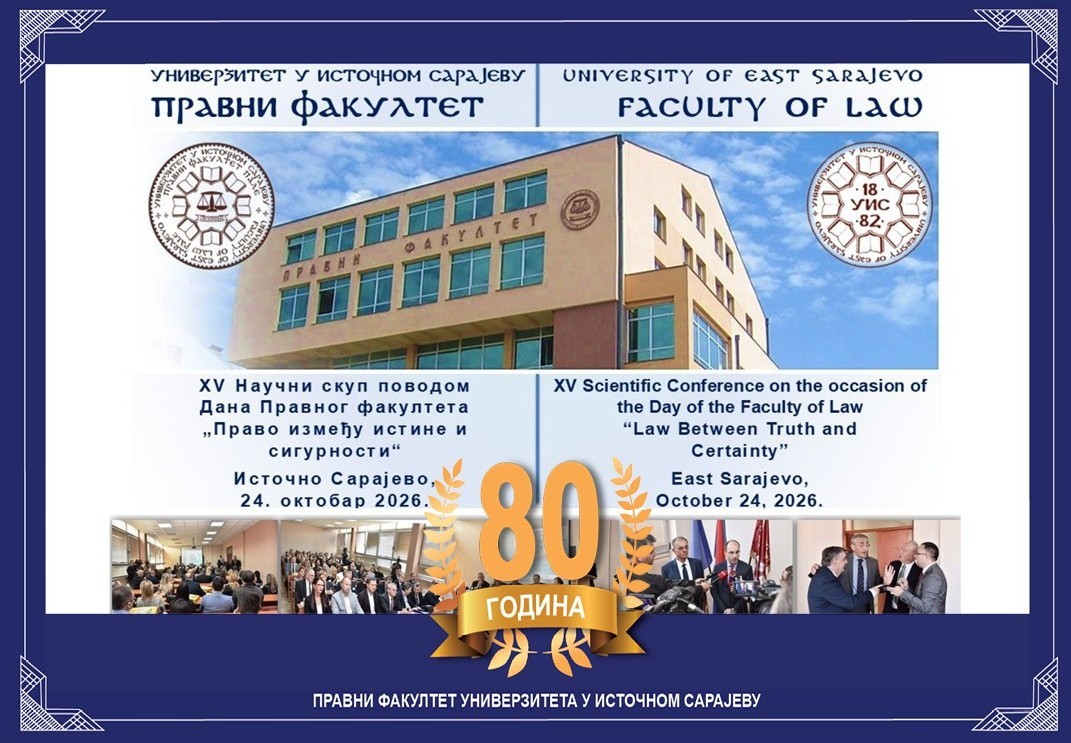 Education and Scientific Council of the Faculty of Law decided to organize, jointly with the co-organizers, XV Scientific conference on the occasion of the Day of the Faculty of Law, on the comprehensive theme “Law Between Truth and Certainty“, which will be held on 24. October 2026 in Pale.