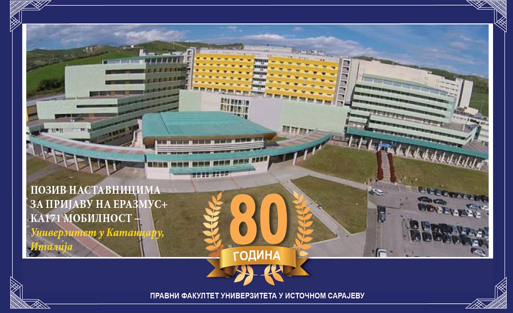 Pozivaju se nastavnici Pravnog fakulteta Univerziteta u Istočnom Sarajevu da se prijave za učešće u programu akademske mobilnosti u okviru Erasmus+ KA171 programa za zimski ili ljetnji semestar akademske 2026/2027. godine na Univerzitetu „Magna Graecia“ u Katancaru (Italija).